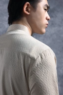 Kemeja ini dirancang dengan potongan Reguler Formal yang memberikan siluet tubuh tegap namun tetap nyaman. Menampilkan sentuhan tegas melalui Panel Depan Asimetris Berbalut Brokat yang memberikan dimensi tekstur mewah dan eksklusif. Penggunaan Kancing tersembunyi menjaga tampilan minimalis, sementara detail kancing pada Panel hadir sebagai aksen dekoratif yang memperkuat karakter desain. Kemeja ini bisa menjadi pilihan untuk berbagai acara istimewa maupun momen formal yang membutuhkan perpaduan antara tradisi dan high-fashion.