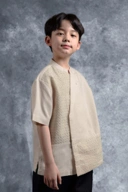 Beskap ini hadir dengan potongan Reguler Formal yang memberikan siluet tubuh tegap serta kesan gagah yang berwibawa. Desain ini menonjolkan panel depan asimetris dengan kerah Sanghai, berbalut aksen brokat yang memberikan dimensi tekstur mewah dan eksklusif khas busana bangsawan yang dikemas modern.