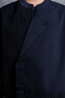 Beskap ini hadir dengan potongan Reguler Formal yang memberikan siluet tubuh tegap serta kesan gagah yang berwibawa. Desain ini menonjolkan panel depan asimetris dengan kerah Sanghai, berbalut aksen brokat yang memberikan dimensi tekstur mewah dan eksklusif khas busana bangsawan yang dikemas modern.
