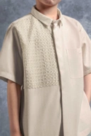 Kemeja ini dirancang dengan potongan Reguler Formal yang memberikan siluet tubuh tegap namun tetap nyaman untuk penggunaan sepanjang hari. Menampilkan sentuhan tegas melalui panel depan berbalut brokat square pada sisi kanan yang memberikan dimensi tekstur mewah dan eksklusif.