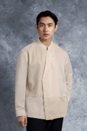 Beskap ini hadir dengan potongan Reguler Formal yang memberikan siluet tubuh tegap serta kesan gagah yang berwibawa. Desain ini menonjolkan panel depan asimetris dengan kerah Sanghai, berbalut aksen brokat yang memberikan dimensi tekstur mewah dan eksklusif khas busana bangsawan yang dikemas modern.