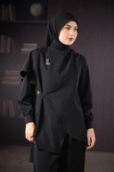 Blouse dengan aksen drapery dan detail strap buckle dengan material semiwool yang firm, lembut, ringan dan tidak mudah kusut