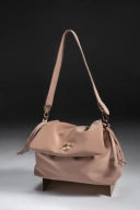 Tas ini memiliki tampilan yang lembut dengan bahan berkilau yang berkualitas tinggi. Desainnya menonjolkan lipatan alami pada bagian penutup (flap) yang memberikan kesan kasual namun tetap mewah.