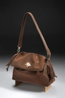 Tas ini memiliki tampilan yang lembut dengan bahan berkilau yang berkualitas tinggi. Desainnya menonjolkan lipatan alami pada bagian penutup (flap) yang memberikan kesan kasual namun tetap mewah.