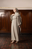 Model dress panjang dengan detail mantel panjang menjuntai