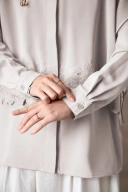 Detail layering depan model vest dengan bordir cut-out bunga yang cantik