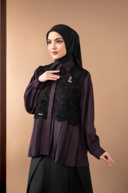 Kemeja dengan kombinasi bahan brocade, dengan detail pleat rempel di bagian bawah