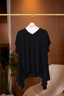 Top dengan model potongan handkerchief dan melebar di bagian bawah