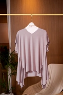 Top dengan model potongan handkerchief dan melebar di bagian bawah