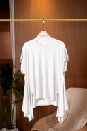Top dengan model potongan handkerchief dan melebar di bagian bawah