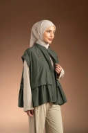 Frill vest ini menghadirkan gaya modest kontemporer dengan fokus pada tekstur dan layering. Outer vest berbahan crinkle memberikan karakter visual yang dinamis melalui potongan bertingkat dan siluet relaxed, menciptakan kesan modern namun tetap effortless