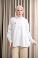Kancing gold pada cuff asimetris menambah kesan manis pada kemeja