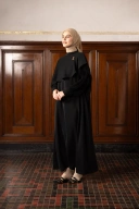 Model dress panjang dengan detail mantel panjang menjuntai