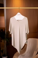 Dengan bukaan leher v neck dan detail jahitan unik pada bagian depan