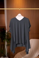 Top dengan model potongan handkerchief dan melebar di bagian bawah