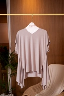 Top dengan model potongan handkerchief dan melebar di bagian bawah