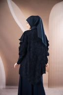 Model tunik dengan detail rumbai asimetris di bagian tangan dan bawah, berkesan modern