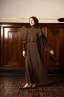 Model dress panjang dengan detail mantel panjang menjuntai