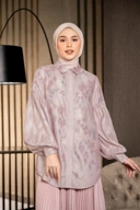 Potongan lengan dengan detail kerut dan motif yang berbeda dilengkapi dengan manset