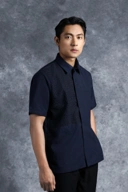 Kemeja ini dirancang dengan potongan Reguler Formal yang memberikan siluet tubuh tegap namun tetap nyaman untuk penggunaan sepanjang hari. Menampilkan sentuhan tegas melalui desain asimetris berbalut brokat square pada sisi kanan yang memberikan dimensi tekstur mewah dan eksklusif.