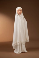 Mukena Renjana anak dengan renda di bawah kerudung dirancang khusus untuk memberikan kenyamanan, kepraktisan, dan tampilan manis bagi anak-anak.